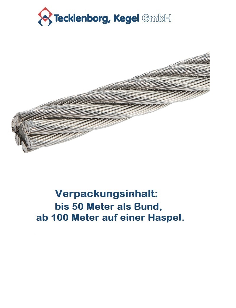 | Konfektionierung: | Das Drahtseil wird bis zu einer Länge von 50 Metern im Ring gebunden - ab 51 Metern (Maximallänge 1000 m) auf Haspel gewickelt, geliefert |