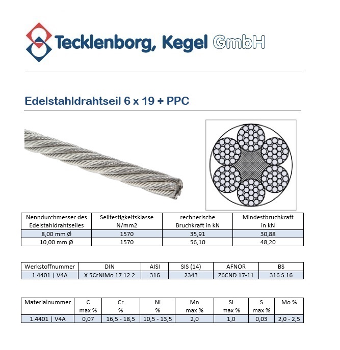 Edelstahlseil 1.4401 6x19 +PP Ø 8,00 mm. Der Seildurchmesser beträgt 8,00 mm und die Seilkonstruktion ist 6x19 +PP. Es handelt sich um eine Polypropyleneinlage und das Material ist Edelstahl 1.4401. Die Bruchlast liegt bei 30,85 kN. Das Drahtseil hat folgende Eigenschaft: hohe Dehnung und Flexibilität.Das Edelstahldrahtseil in der Konstruktion 6x19+PPC Norm EN 12385-4:2002 (ehem. DIN 3060), besteht aus Edelstahl rostfrei (Werkstoff 1.4401). Dieses rostfreie Edelstahldrahtseil verfügt über eine hohe Dehnung und Flexibilität.