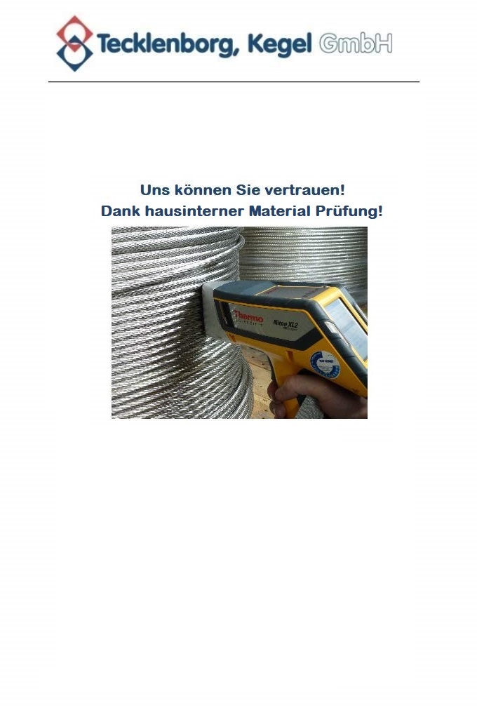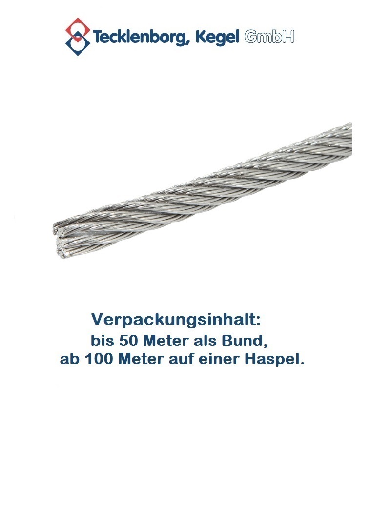 | Konfektionierung: | Das Drahtseil wird bis zu einer Länge von 50 Metern im Ring gebunden - ab 51 Metern (Maximallänge 1000 m) auf Haspel gewickelt, geliefert |