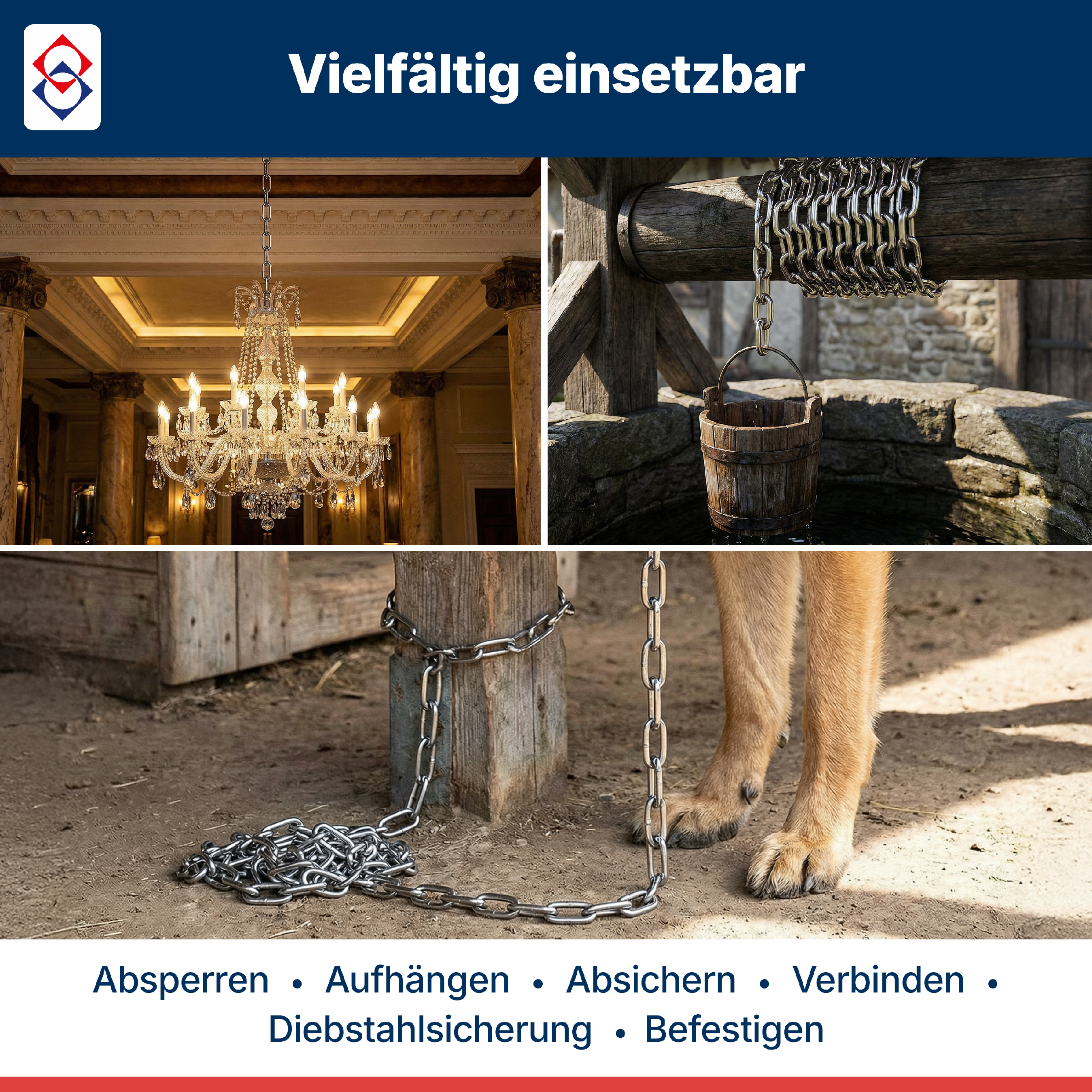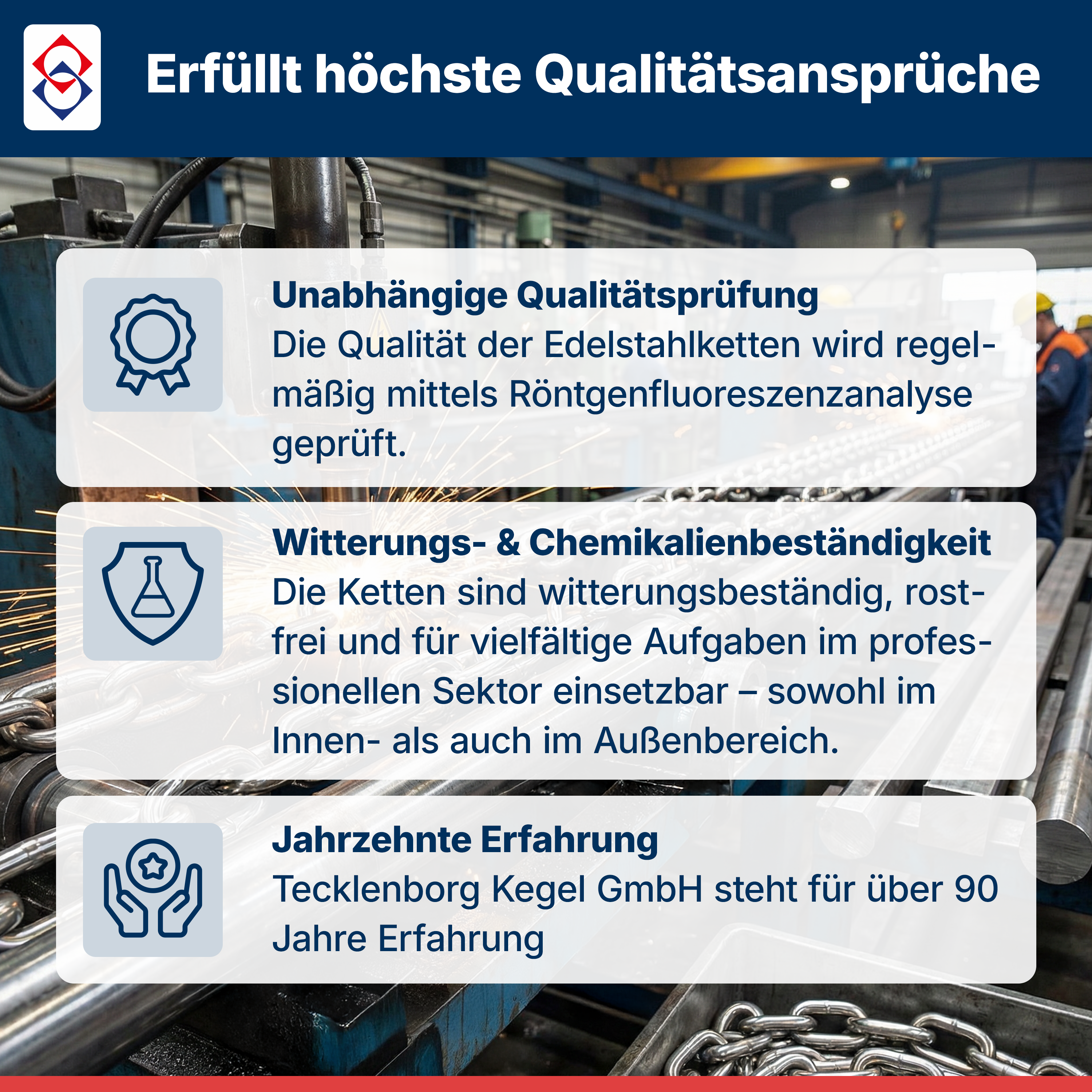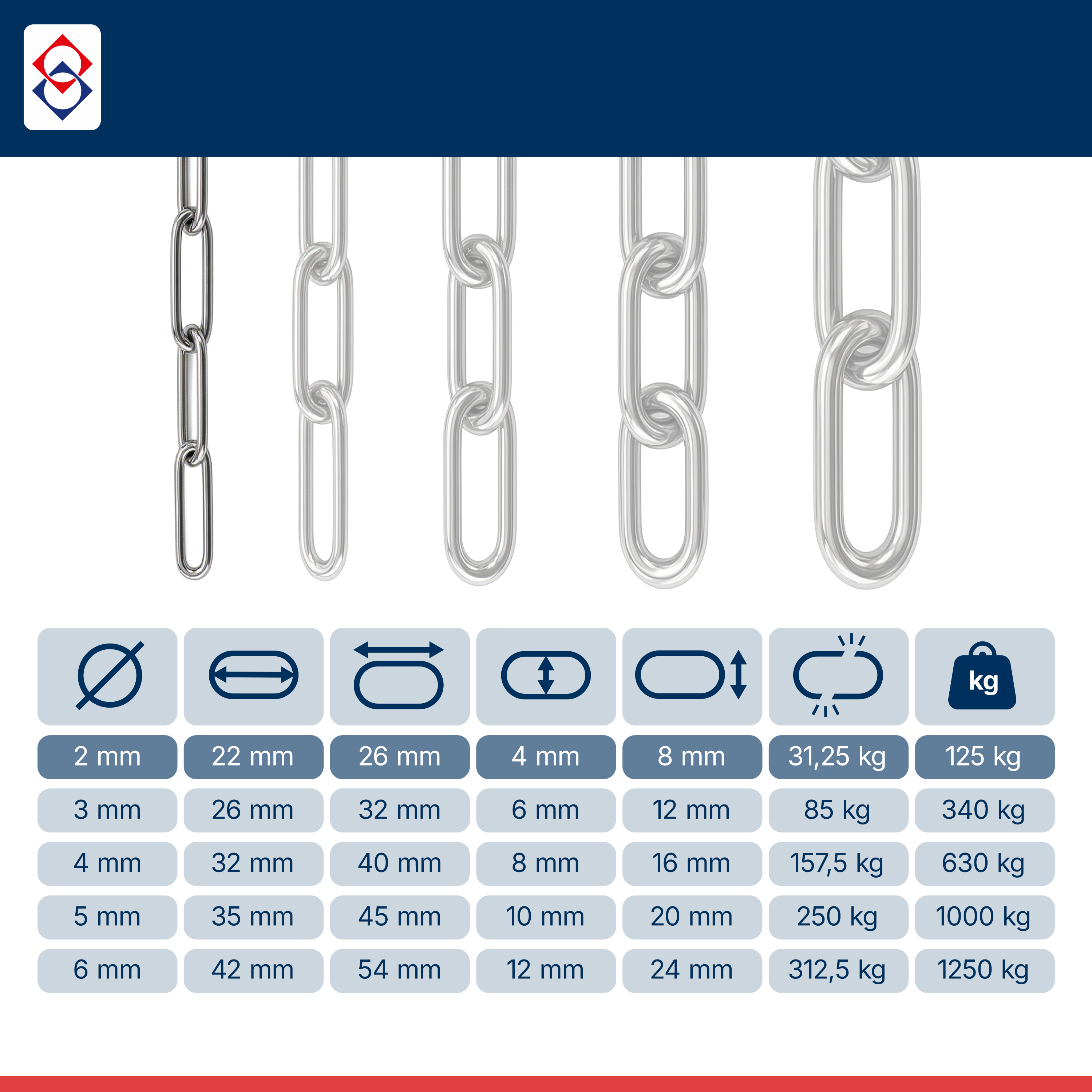 Niro-Kette ähnl. DIN 763, 2,00 mm. Der Durchmesser beträgt 2,00 mm und die Bruchlast beläuft sich auf 0,125 to. Das Material ist Edelstahl 1.4401.Die langgliedrige Kette ähnl. DIN 763 besteht aus dem Werkstoff 1.4401. Die Oberfläche ist poliert.