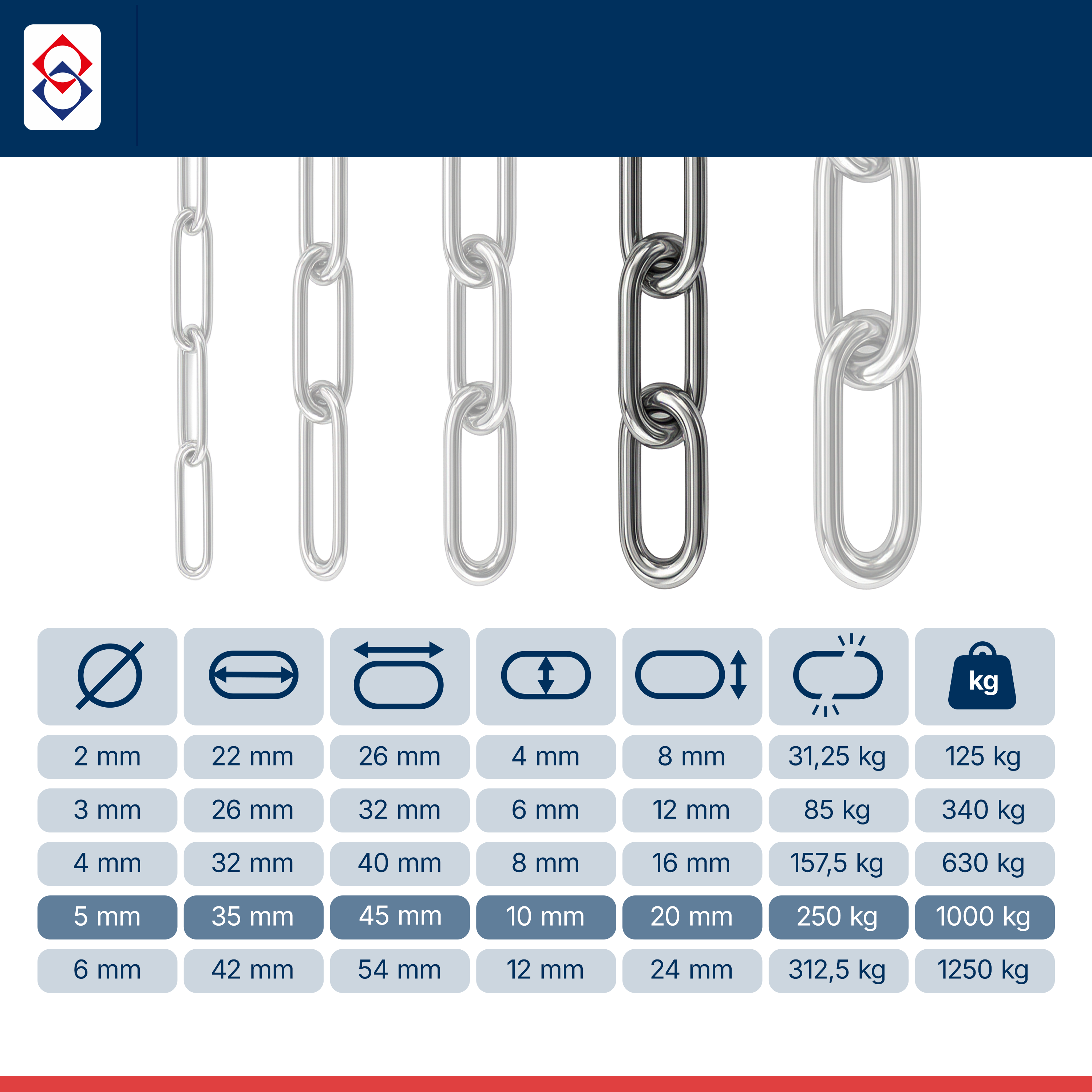 Niro-Kette ähnl. DIN 763, 5,00 mm. Der Durchmesser beträgt 5,00 mm und die Bruchlast beläuft sich auf 1,00 to. Das Material ist Edelstahl 1.4401.Die langgliedrige Kette ähnl. DIN 763 besteht aus dem Werkstoff 1.4401. Die Oberfläche ist poliert.