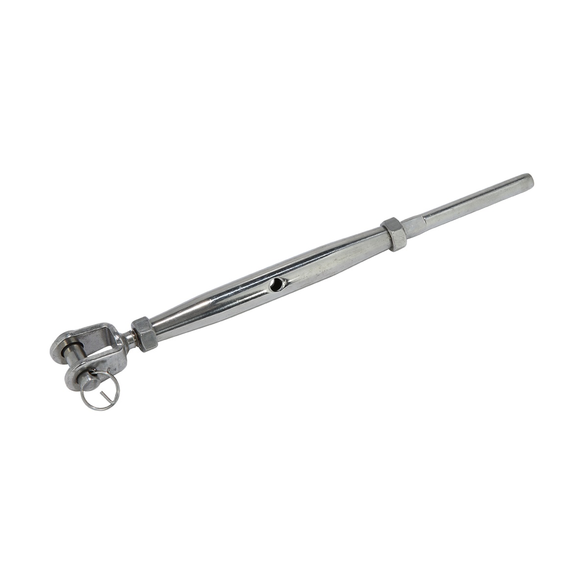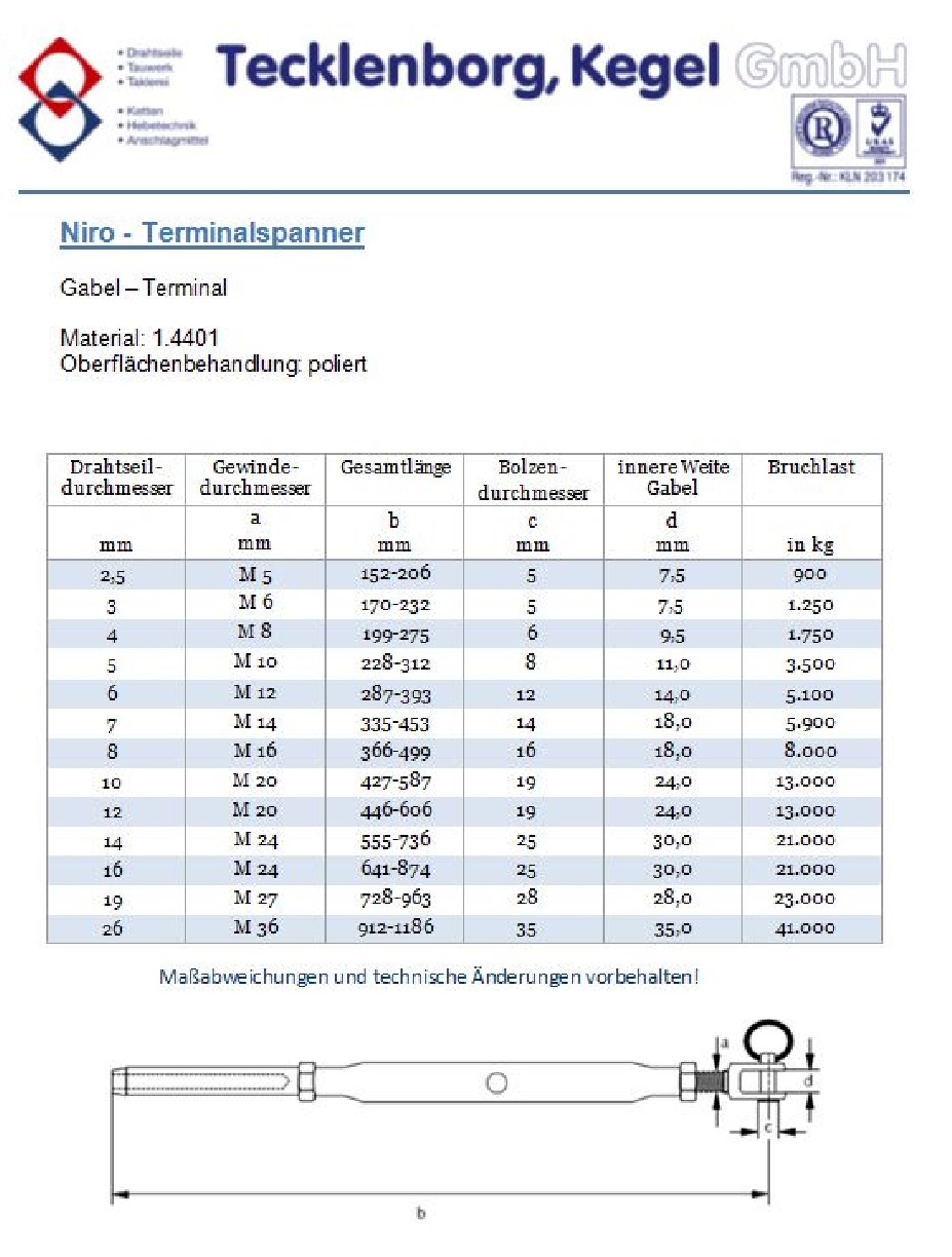 Niro-Terminalspanner M8 / 4,00 mm. Ausfertigung: Gabel/Terminal und die Gewindegröße ist M08 / 4,00 mm. Die Bruchlast beläuft sich auf 1,75 to.Der Wantenspanner besteht aus Edelstahl rostfrei (Werkstoff 1.4401). Ein Ende ist mit einer Gabel, das andere Ende ist mit einem Walzterminal versehen. Die Oberfläche ist poliert.