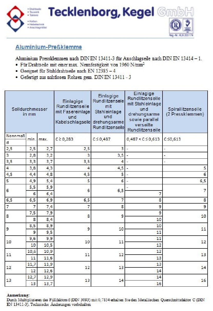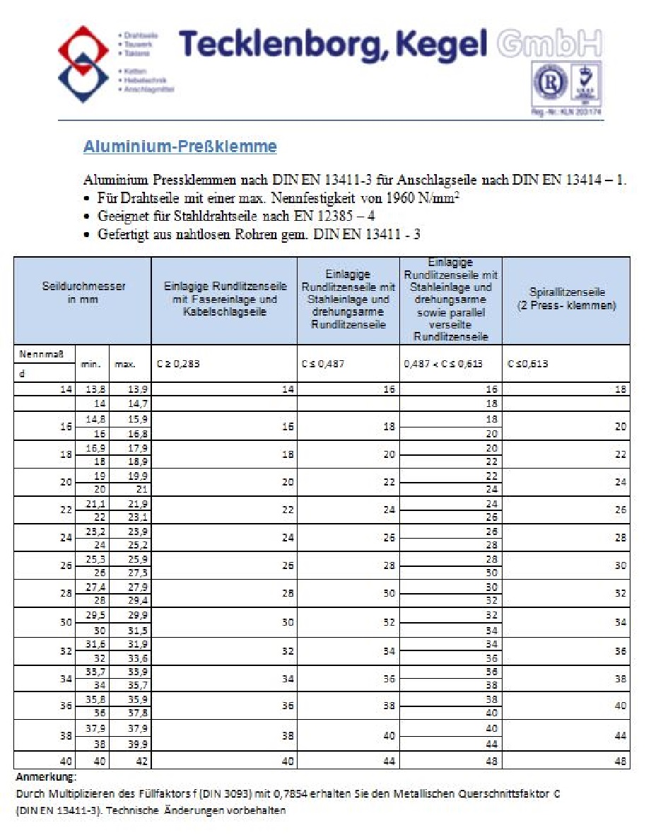 Aluminium-Pressklemme DIN EN 13411-3 Z 1,5. Die Nenngröße ist Z 1,50 und ist für Drahtseile mit Fasereinlage von 1,5 mm Ø geeignet. Das Material ist Aluminium. Aluminium Pressklemmen sind nach DIN EN 13411-3 für Anschlagseile nach DIN EN 13414 gefertigt. Besondere Merkmale: Für Drahtseile mit einer max. Nennfestigkeit von 1960 N/mm². Geeignet für Stahldrahtseile nach EN 12385 4. Gefertigt aus nahtlosen Rohren gem. DIN EN 13411 3. Lieferbar in den Größen 2,5 60. Außerhalb der Norm in den Größen 1,0 2,0. Verarbeitung mit glatt zylindrischen Pressbacken mit Schneproduct_idekanten. Für Drahtseile mit Stahleinage sollte die nächst mögliche Nenngröße benutzt werden.