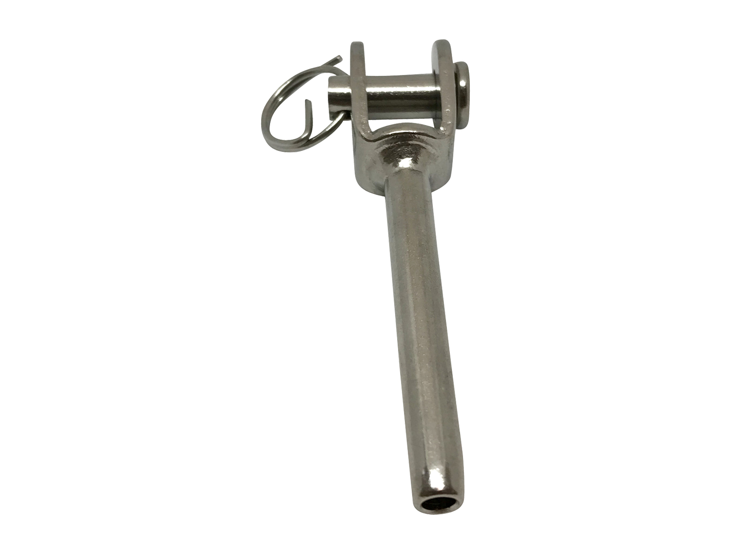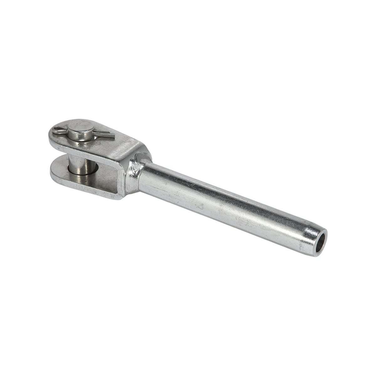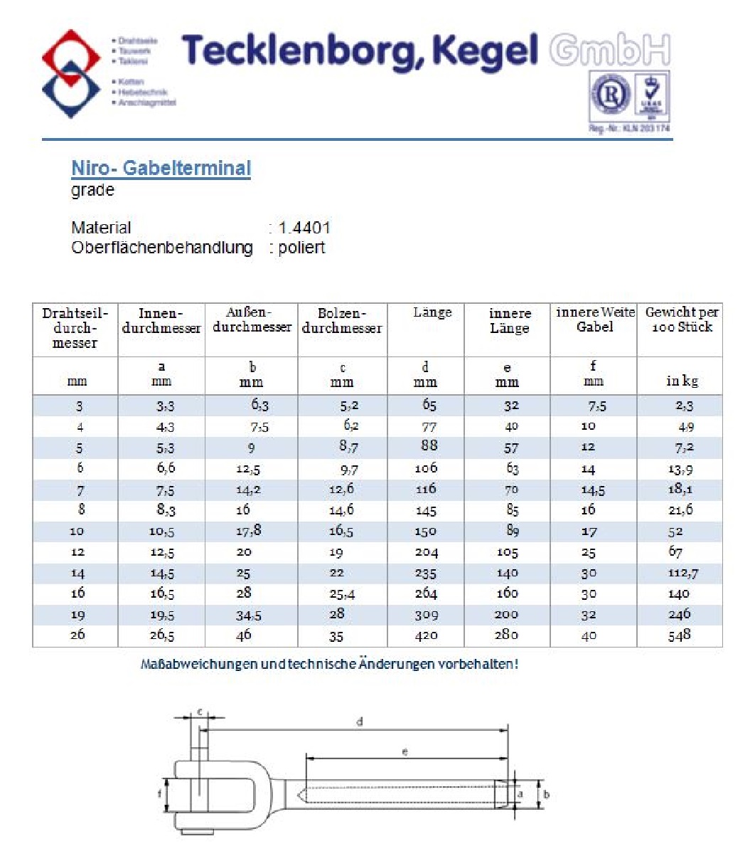 Niro-Gabelterminal 4,00 mm. Der Seildurchmesser für dieses Gabelterminal beträgt 4,00 mm und das Material ist Edelstahl 1.4401.Das Gabelterminal besteht aus Edelstahl rostfrei (Werkstoff 1.4401). Die Oberfläche ist poliert.