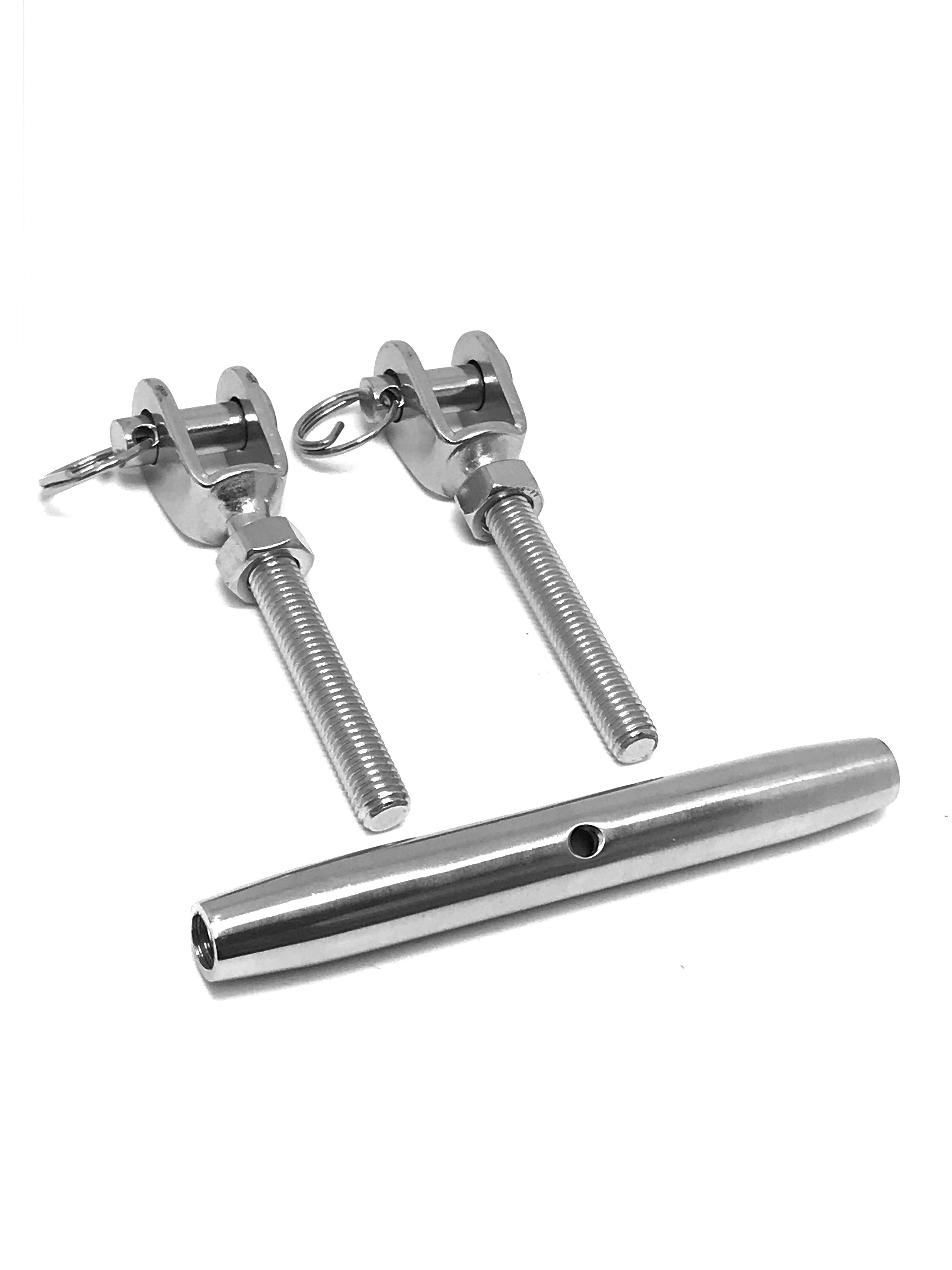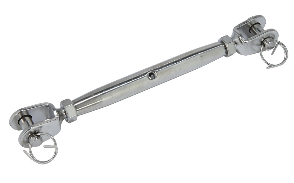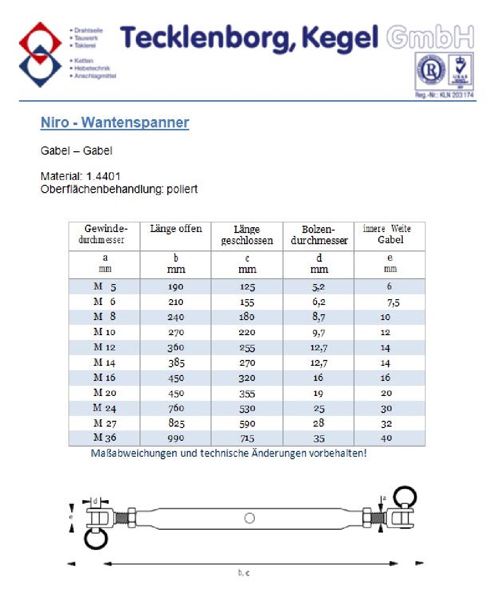 Niro-Wantenspanner mit 2 Gabeln M6. Ausfertigung: beproduct_idseitig Gabel und die Gewindegröße ist M06. Die Bruchlast beläuft sich auf 1,25 to.Der Wantenspanner besteht aus Edelstahl rostfrei (Werkstoff 1.4401). Beproduct_ide Enden sind mit Gabeln versehen. Die Oberfläche ist poliert.